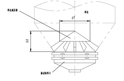 該產(chǎn)品在設(shè)計計算中已考慮了一定的倉壓,但建議在料倉內(nèi)物料高度大于2m時,在料倉內(nèi)安裝料倉減壓錐,以確保振動給料斗更穩(wěn)定地工作,特別是確保其給料精度更趨準確。料倉減壓錐應(yīng)焊接在料倉內(nèi),并保持平穩(wěn)。