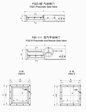 注:1.FQZ-III型氣手動閘門的高度為H1,其他尺寸同氣動閘門。